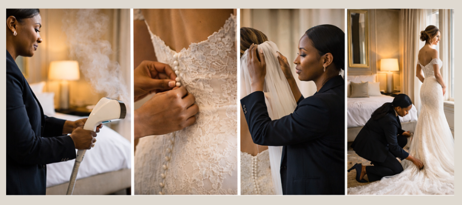 "Silveeeeeeerrrrrrrrrr😂, I’m so glad I found this service, my friends thought I was crazy when I wanted a bridal dresser and when Silver came steamed my dress and veil, arranged my dress during my photographs, helped me into my reception dress and packed it away, it would have been so stressful and chaotic, my bridesmaids would not have been able to do it. Amazing service, highly recommended and brides, it is so worth it, just for the peace of mind."