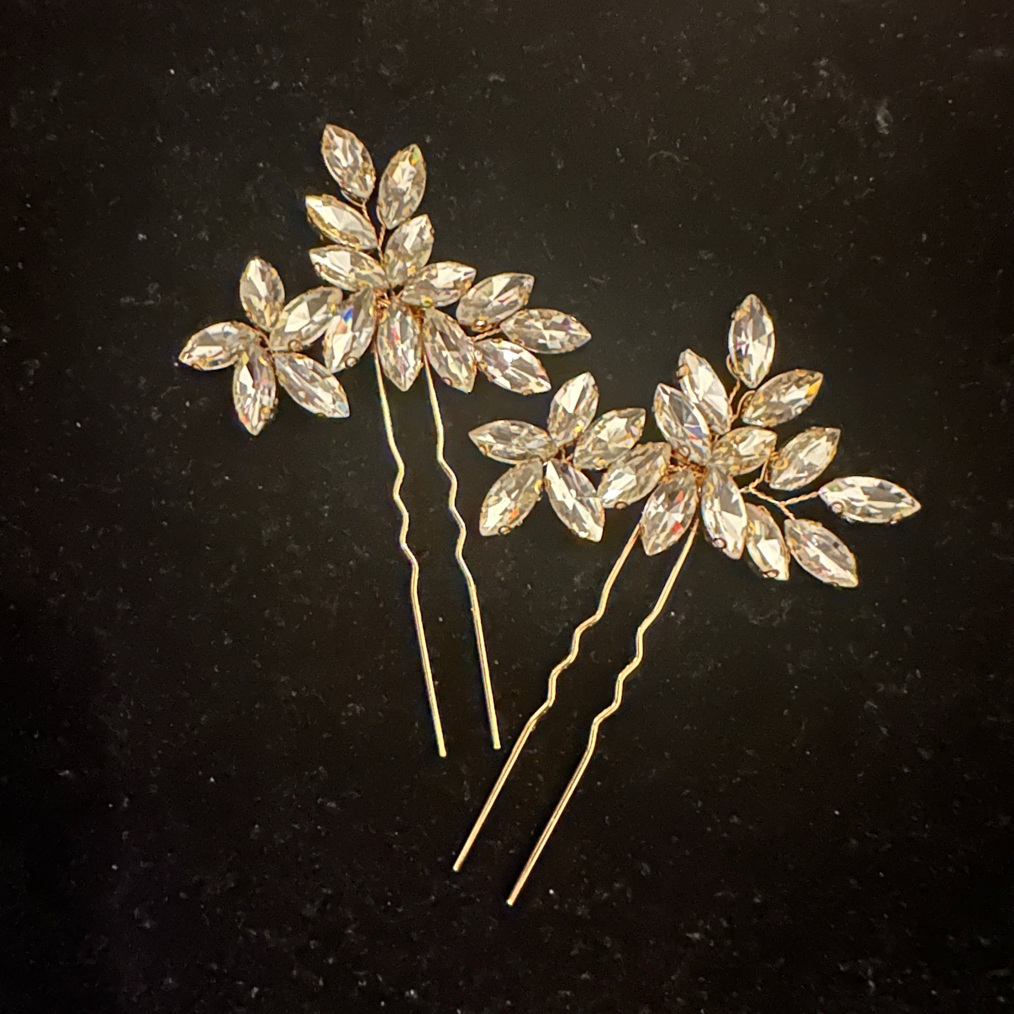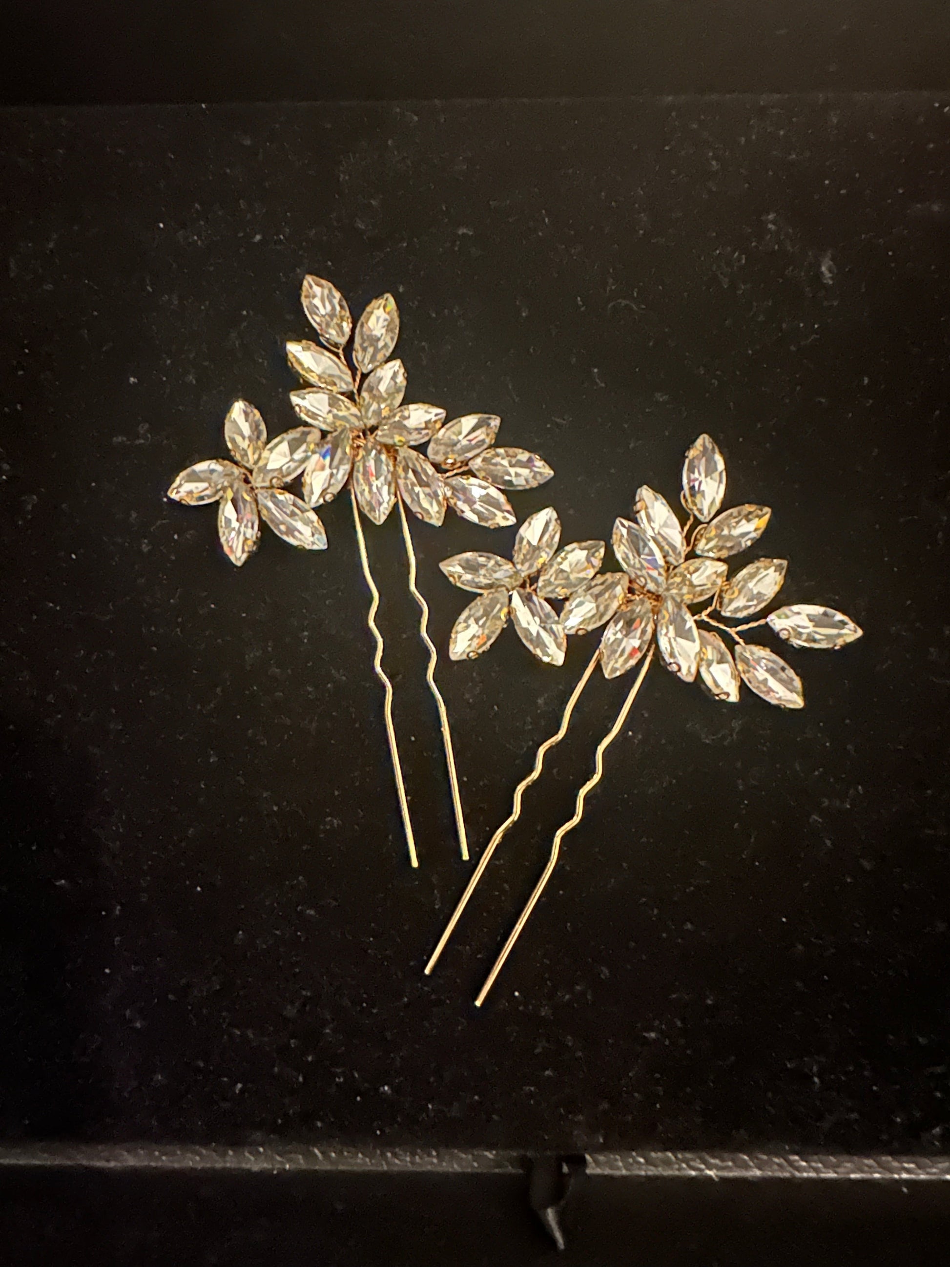 Transform your hairstyle into a stunning masterpiece with our Gold with Clear Crystal Hair Pins Set of 2. Perfect for your wedding day or any special event, these hair pins are designed to shine a light on your beauty. Embrace a timeless elegance that complements both classic and modern bridal styles.